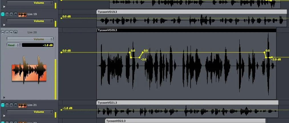 Not "bad", but it could use a little work. In fact, it actually had a little work done as far as levels. Are concerned before I bounced this clip for you to hear. Chiefly, I used some volume automation to lower the harshness of some of the constants that this actor performed. A lot of audio engineering is taking a great performance that has just a few issues and "saving it". This was one of those times. You can see in the screen shot below some of the automation that was inserted. (The yellow line across the large waveform).
