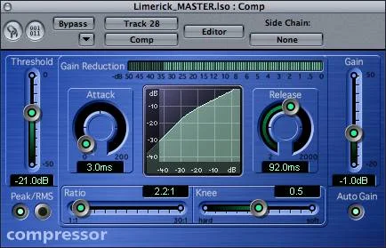 Now that you are dealing with the right frequency band, time to gently compress the signal. Compression is one of the most useful (and used) plugs/effects used in modern music production. However, it has been in used in one form another by the pros for decades! The most important part of this control is the ratio. Here, I'm compressing 2.2:1.