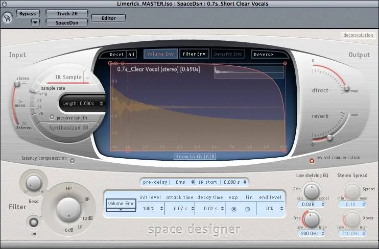 I didn't use a lot of reverb on this track, but just a little for space can really help make it sound like the voice wasn't recorded in a closet. (Which it basically was.) Notice how low the "reverb" slider is set for here. Also, the preset called "Clear Vocal" is a very short reverb (.690s) anyway, so this is not a "hall" type sound or anything. It's simply meant to enhance the sound.